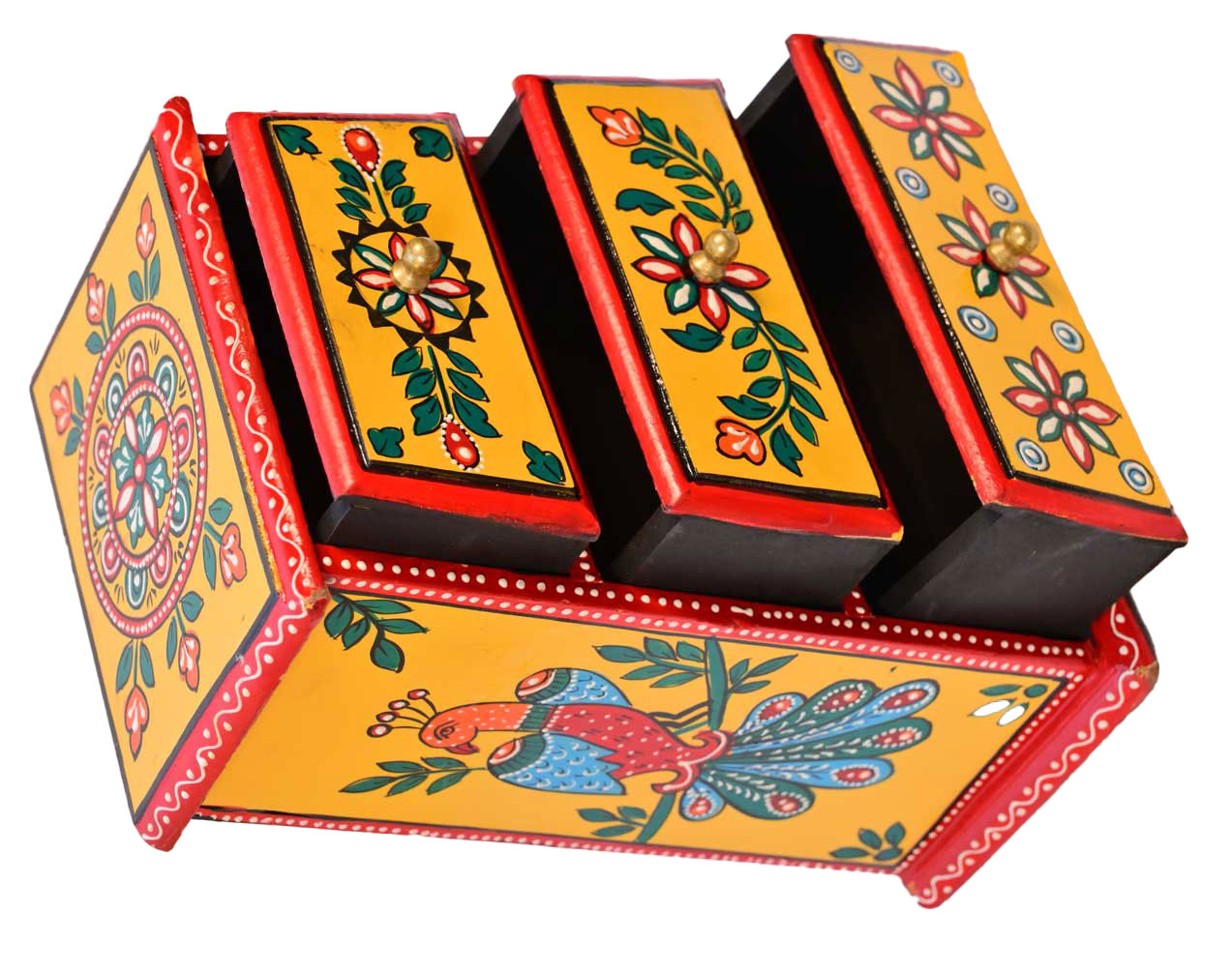This handcrafted 3 Drawer Wooden Painted chest is beautifully made out of solid mango wood and hand painted with delicate traditional motifs. The vivid colors instantly captivate one’s attention and make for a statement piece in your home décor With three drawers, makes for a great storage unit for other things as well. What sets it apart from the other run of the mill side tables is its ethnic design and sturdy built.