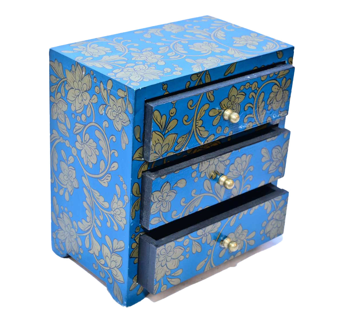 This handcrafted 3 Drawer Wooden Painted chest is beautifully made out of solid mango wood and hand painted with delicate traditional motifs. The vivid colors instantly captivate one’s attention and make for a statement piece in your home décor With three drawers, makes for a great storage unit for other things as well. What sets it apart from the other run of the mill side tables is its ethnic design and sturdy built.